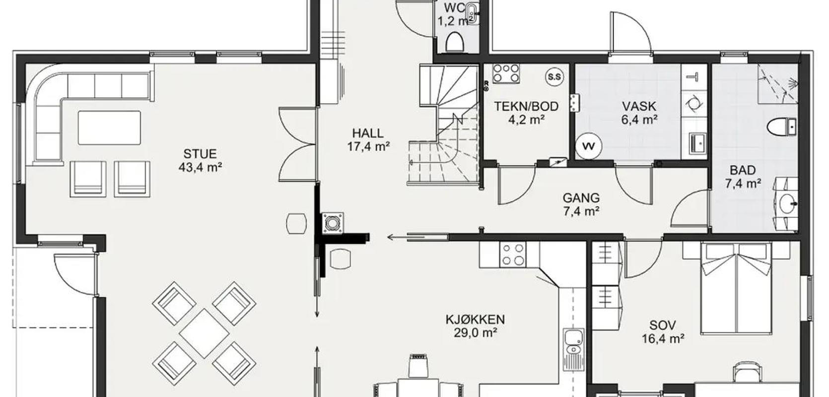 Her har du fire soverom, et gjesterom, stort kjøkken og en vinkelstue, to bad og eget vaskerom, samt en romslig loftstue. Du kan til og med velge å ha flere peiser i huset hvis du ønsker det.