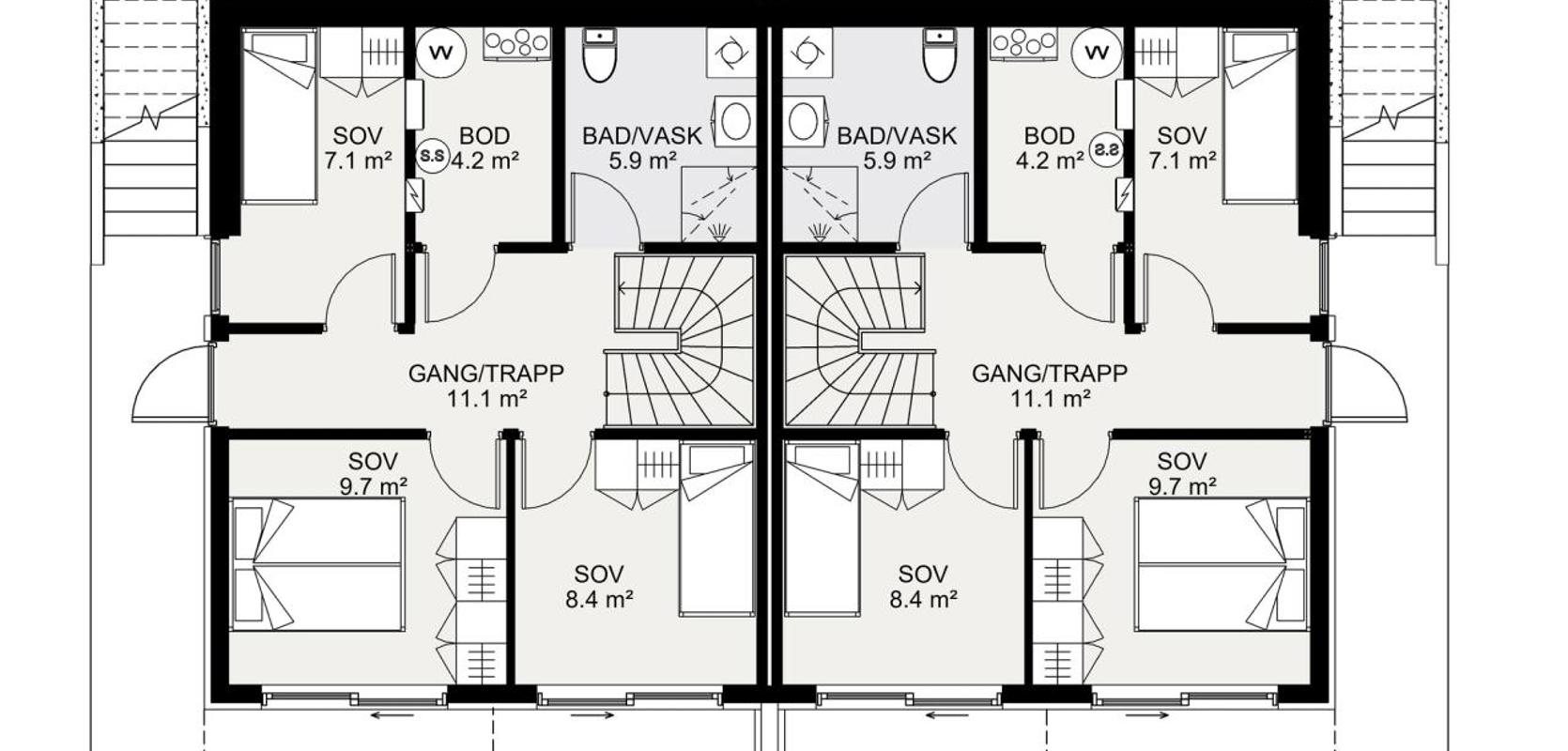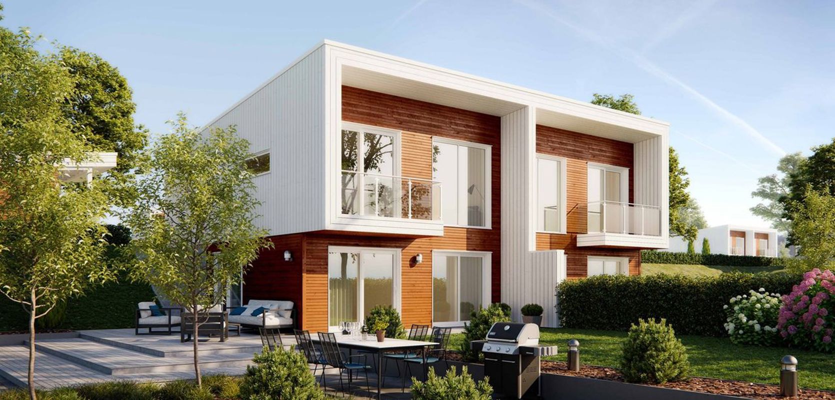Signatur 300 er en moderne tomannsbolig med sitt moderne design, rene linjer og pulttak. Dette er et perfekt hus for deg som ønsker å bygge en tomannsbolig som kombinerer funksjonalitet og estetikk. Huset er skreddersydd for skrå tomt.