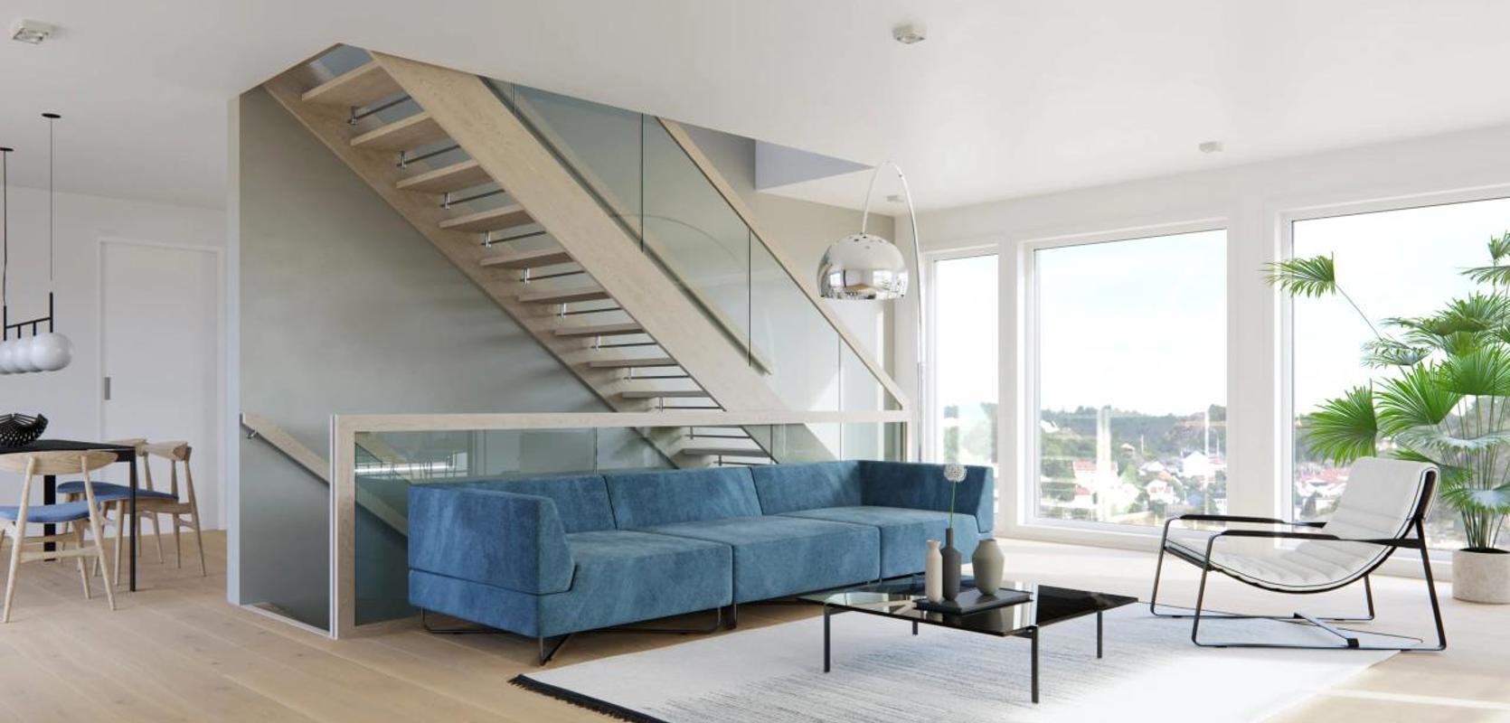 Dette huset gjør seg godt på skrå tomt. Det gir deg både privatliv og godt utsyn, og er en tidløs bolig som er svært romslig og funksjonell.