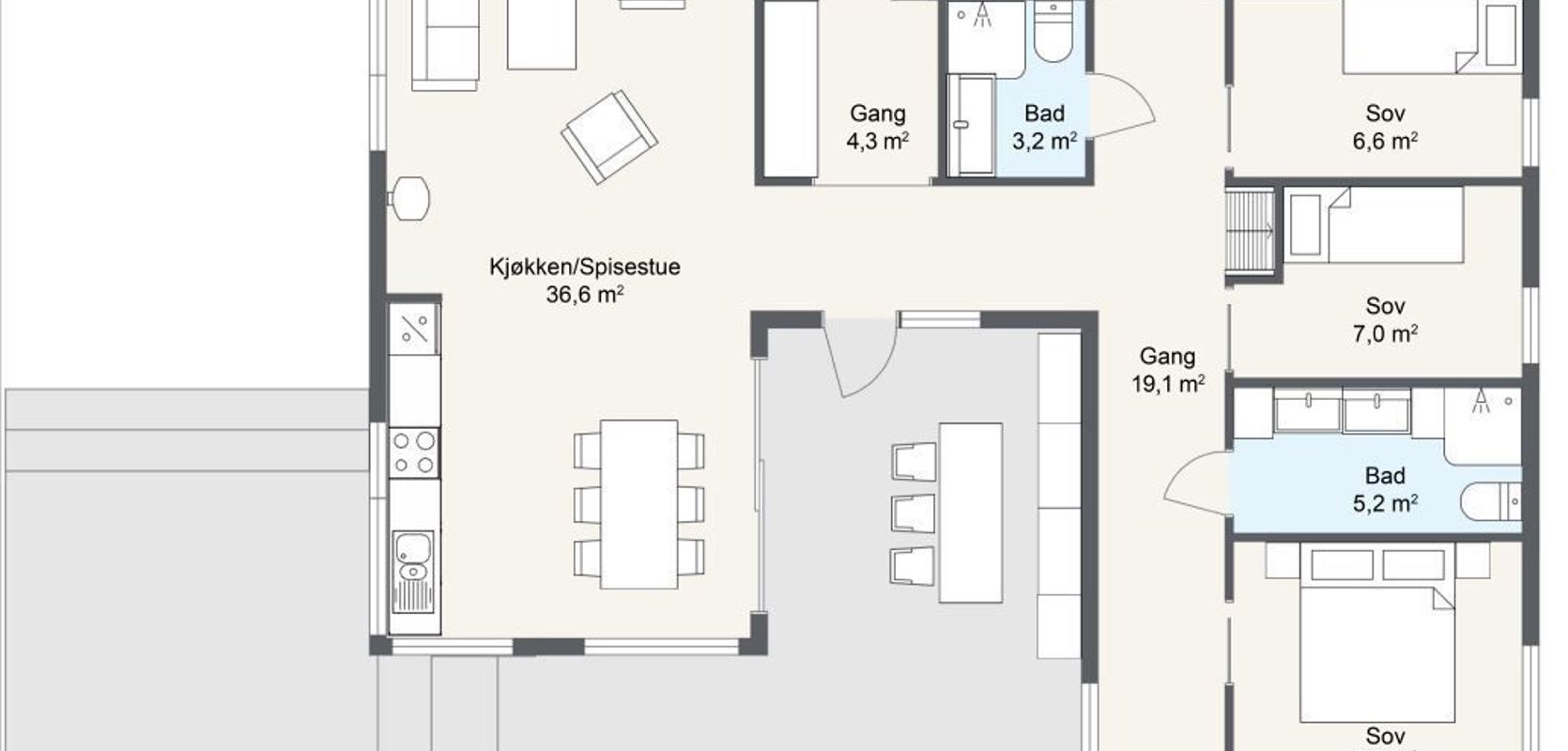 Private sonen: Tre soverom og to bad i den private sonen gir god plass for beboere og eventuelle gjester. Plasseringen av hovedsoverommet med utsikt mot sør og øst gir deg muligheten til å nyte naturlig lys og det vakre landskapet. To mindre soverom vender med øst.