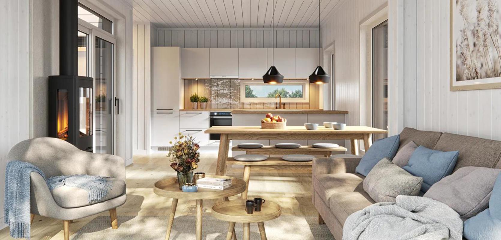 Peisen i oppholdsrommet er strategisk plassert nær sitteområdet og spiseplassen. De store vinduene i oppholdsrommet gir deg muligheten til å nyte naturen utenfor.